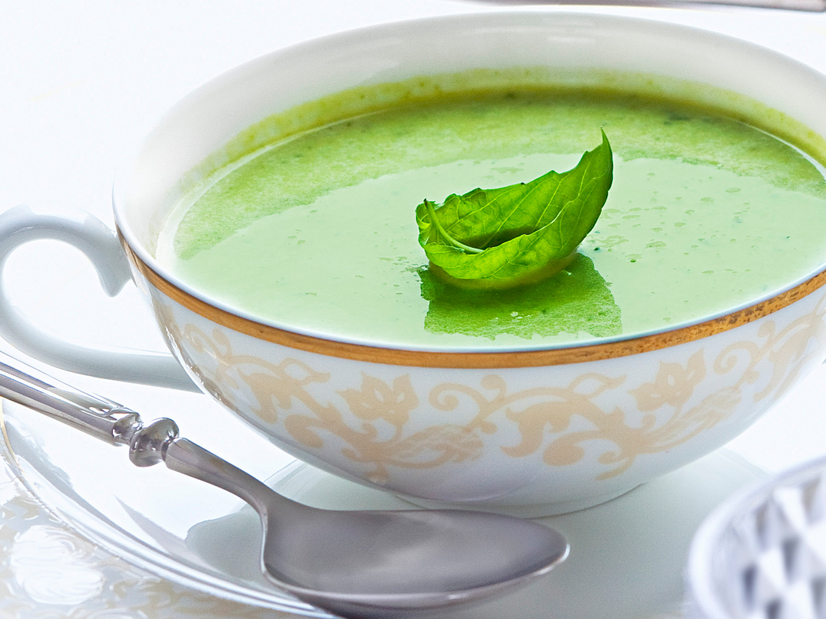 Kuori ja hienonna sipulit. Anna kuullottua öljyssä kattilassa. Lisää joukkoon herneet ja kuuma kanaliemi. Keitä miedolla lämmöllä noin 4 minuuttia, kunnes herneet hieman pehmenevät mutta eivät menetä väriä. Lisää joukkoon basilikanlehdet, smetana ja sitruunamehu. Soseuta keitto sauvasekoittimella. Mausta suolalla ja pippurilla. Kuumenna keitto ja tarjoile heti.