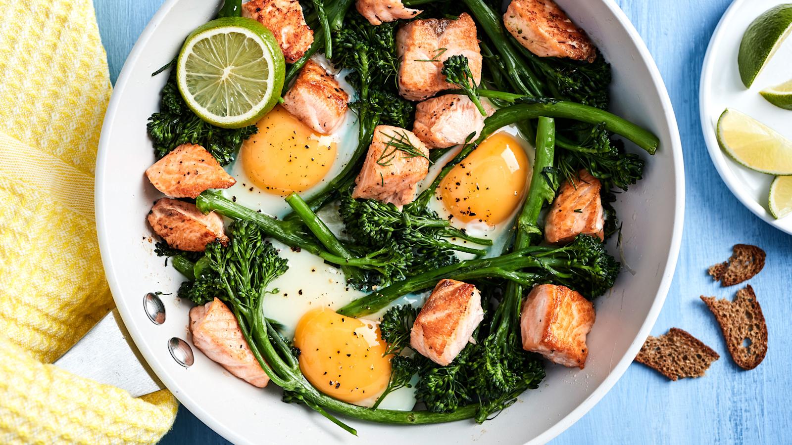 Kuumenna 1 rkl öljyä pannulla. Paista lohipaloja noin 5 minuuttia ja siirrä ne pois pannulta. Lisää 1 rkl öljyä. Laita broccolinit ja sipulit pannulle. Valuta munat niiden väleihin. Kypsennä 3–4 minuuttia. Mausta suolalla ja pippurilla. Lisää lohi ja kuumenna.