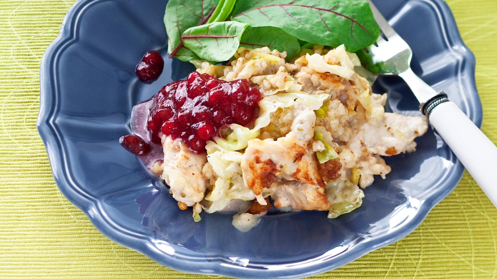 Yhdistä kulhossa ohrasuurimot, broileri-sipuliseos ja kaali. Siirrä ne voideltuun ja tilavaan uunivuokaan. Kaada päälle kerma ja kasvisliemi. Hauduta kaalilaatikko kypsäksi 175-asteisen uunin keskitasolla noin tunnin ajan. Tarjoa puolukkahillon kera.