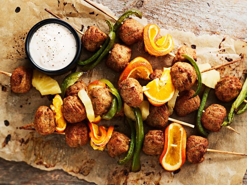 Nopeat broilerivartaat kootaan valmiista broileripyöryköistä. Tikuta mukaan paprikaa, appelsiinia sekä ananasta ja tarjoa lisänä helppoa valkosipulista dippiä.