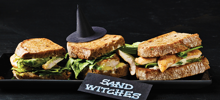 Kasaa täytteet leiville, paina puolikkaat yhteen ja leikkaa sandwicheiksi.