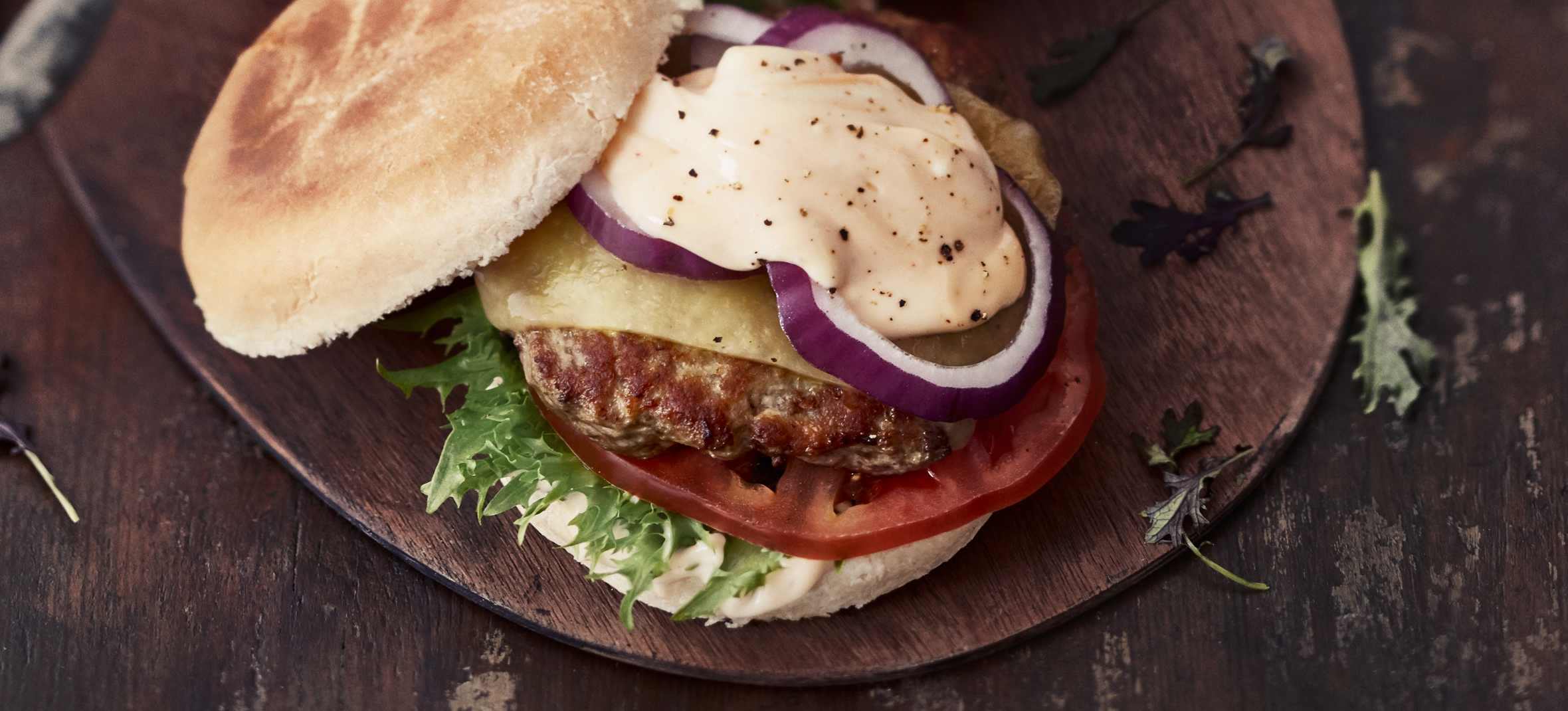 Sivele pihvit oliiviöljyllä ja paista kuumalla grillillä tai paistinpannussa 3–4 minuuttia molemmin puolin. Lopuksi lisää juusto hampurilaispihvin päälle ja anna sulaa hetken.