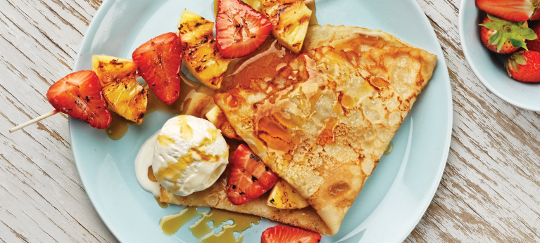 Täytä crepet hedelmillä ja jäätelöllä, taita ja valuta reilusti vaahterasiirappia päälle.
