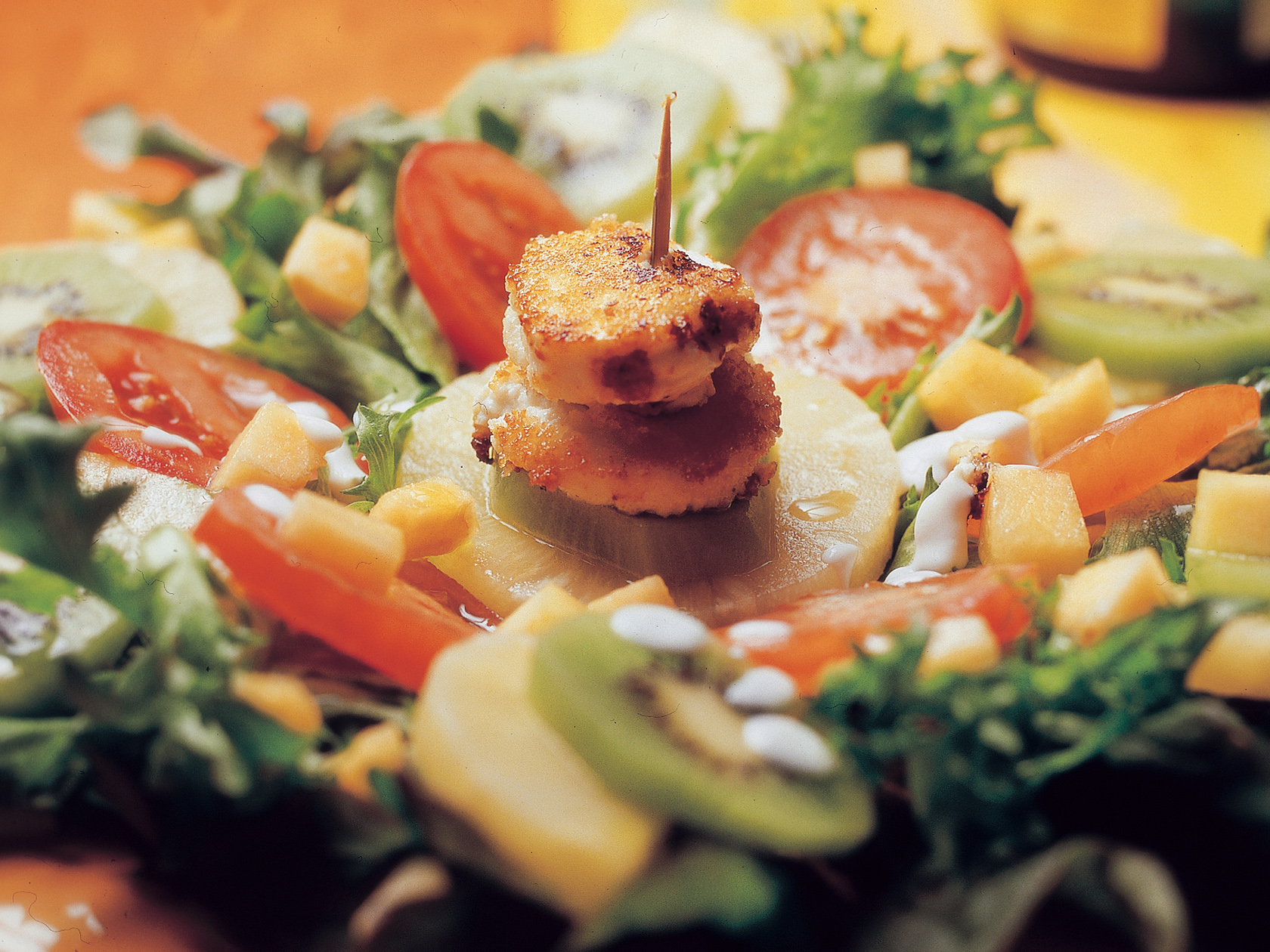 Valuta liemi ananaksista. Kuori ja kuutioi hunajameloni ja kiivit. Kuutioi tomaatit. Revi salaatit isolle tarjoiluvadille. Asettele hedelmät ja tomaattikuutiot päälle. Purista kastiketta varten sitruunan mehu kulhoon. Sekoita öljyn ja viinietikan kanssa. Kaada kastike salaatin päälle. Leikkaa vuohenjuusto kiekoiksi. Kasta ne ensin hunajaan ja sitten korppujauhoihin. Paista öljyssä kullankeltaisiksi. Nostele kiekot salaatin päälle. Pirskota halutessasi päällimmäiseksi maustamatonta jogurttia.