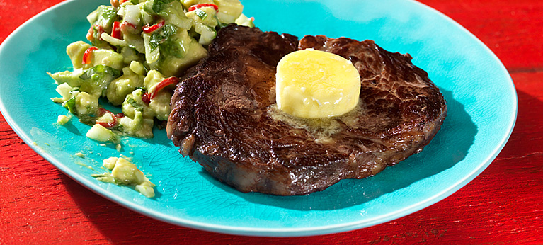 Paista maustetut pihvit kuumassa grillipannussa: ensin 3 minuuttia yhdeltä puolelta ja sitten 2 minuuttia toiselta. Laita vielä 5 minuutiksi kuumaan uuniin. Tarjoa kuumilta lautasilta.