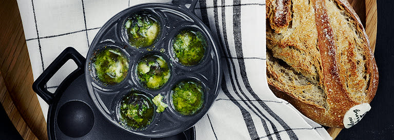 Täytä etanapannun kolot etanoilla ja sinihomejuustomassalla. Paista uunissa (250⁰C) kunnes täyte on sulanut ja alkaa kuplia.