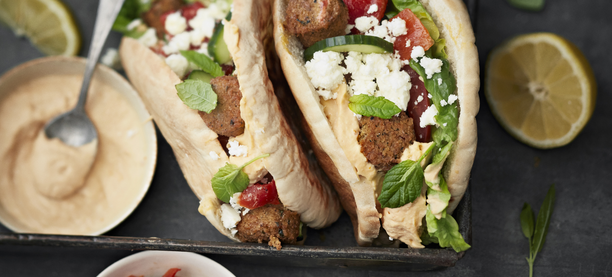 Täytä pitaleivät ja lisää reilusti fetajuustoa ja hummusta. Mausta sitruunalla.