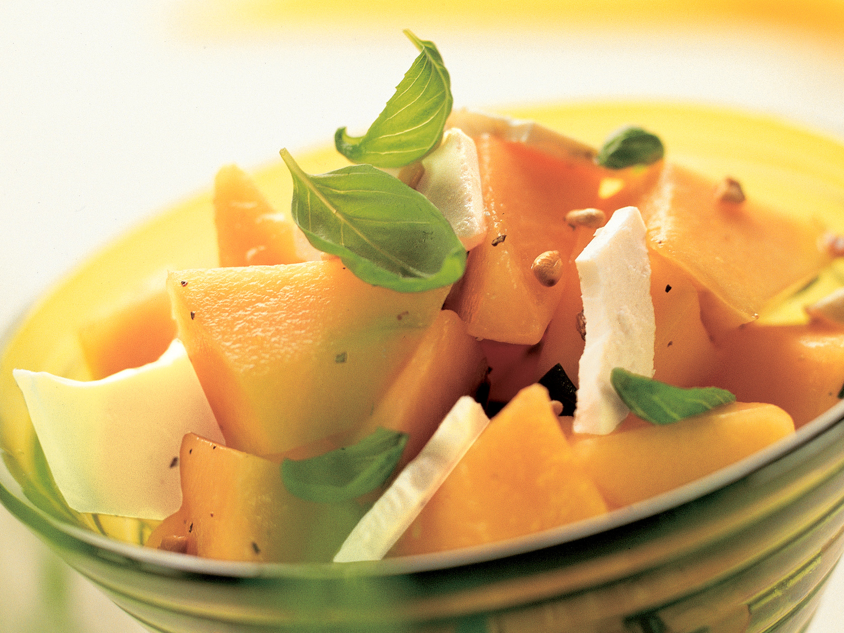 Paloittele meloni reilun kokoisiksi suupaloiksi. Paloittele juusto.Valmista kastike sekoittamalla kaikki ainekset keskenään ja kaada kastike melonipaloille. Sekoita joukkoon basilika ja anna maustua noin ½ tunnin ajan. Lisää salaatin päälle vielä juustopalat ja halutessasi kuumalla kuivalla pannulla paahdetut auringonkukansiemenet. Tarjoile väliruokana tai lisäkesalaattina.
