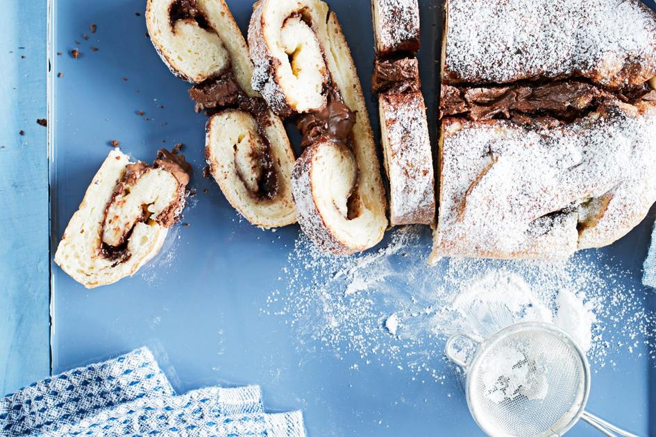 Paina tarvittaessa saumaa uudestaan kiinni. Voitele pitko munalla ja levitä loppu suklaa-pähkinälevite vakoon sauman päälle. Paista pitkoa uunin alatasolla noin 20 minuuttia. Koristele halutessasi jäähtyneenä tomusokerilla.