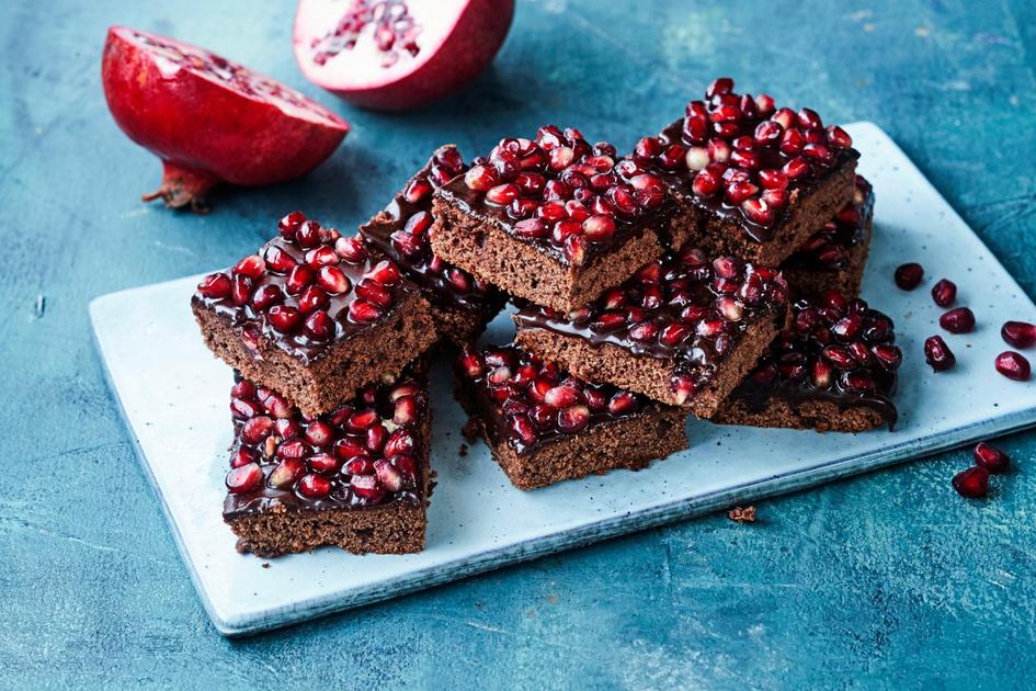 Levitä kuorrute lämpimänä pohjan päälle. Irrota granaattiomenasta siemenet ja lisää ne kuorrutteen pinnalle ennen kuin kuorrute kovettuu.