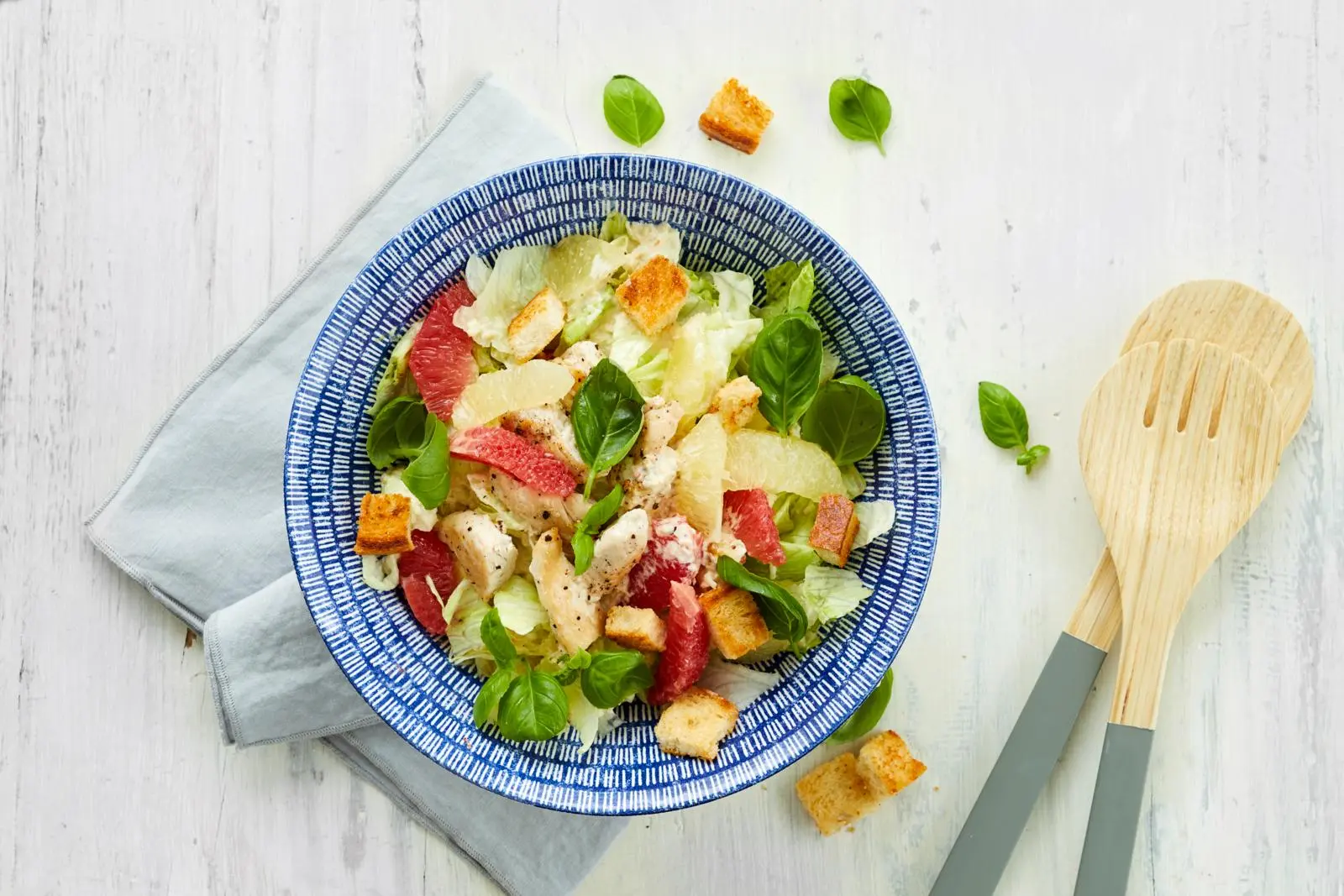 Sekoita salaatin joukkoon osa kastikkeesta. Lisää päälle broileri- ja greippipalat, leipäkuutiot ja basilika. Tarjoa loppu kastike erikseen.