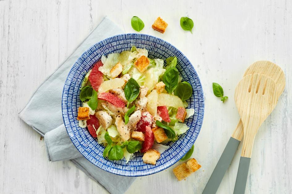 Kanacaesarsalaatti raikastetaan greipillä. Paistetut kanan sisäfileet tekevät salaatista ruokaisan ja salaatti kruunataan greippimehulla tuunatulla kastikkeella.