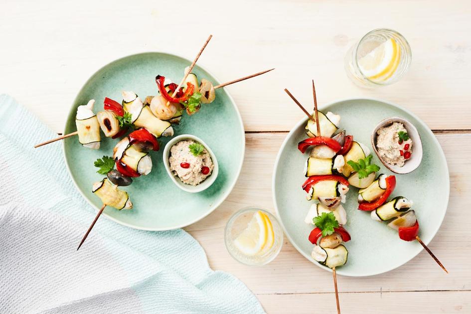 Kääräise sitrusmarinoitu siika kesäkurpitsarullan sisälle ja sujauta vartaisiin. Vartaiden parina tarjottava chilitahna on satay-kastikkeen päivitetty versio, jossa pähkinöiden sijaan purutuntumaa tuovat paahdetut siemenet.