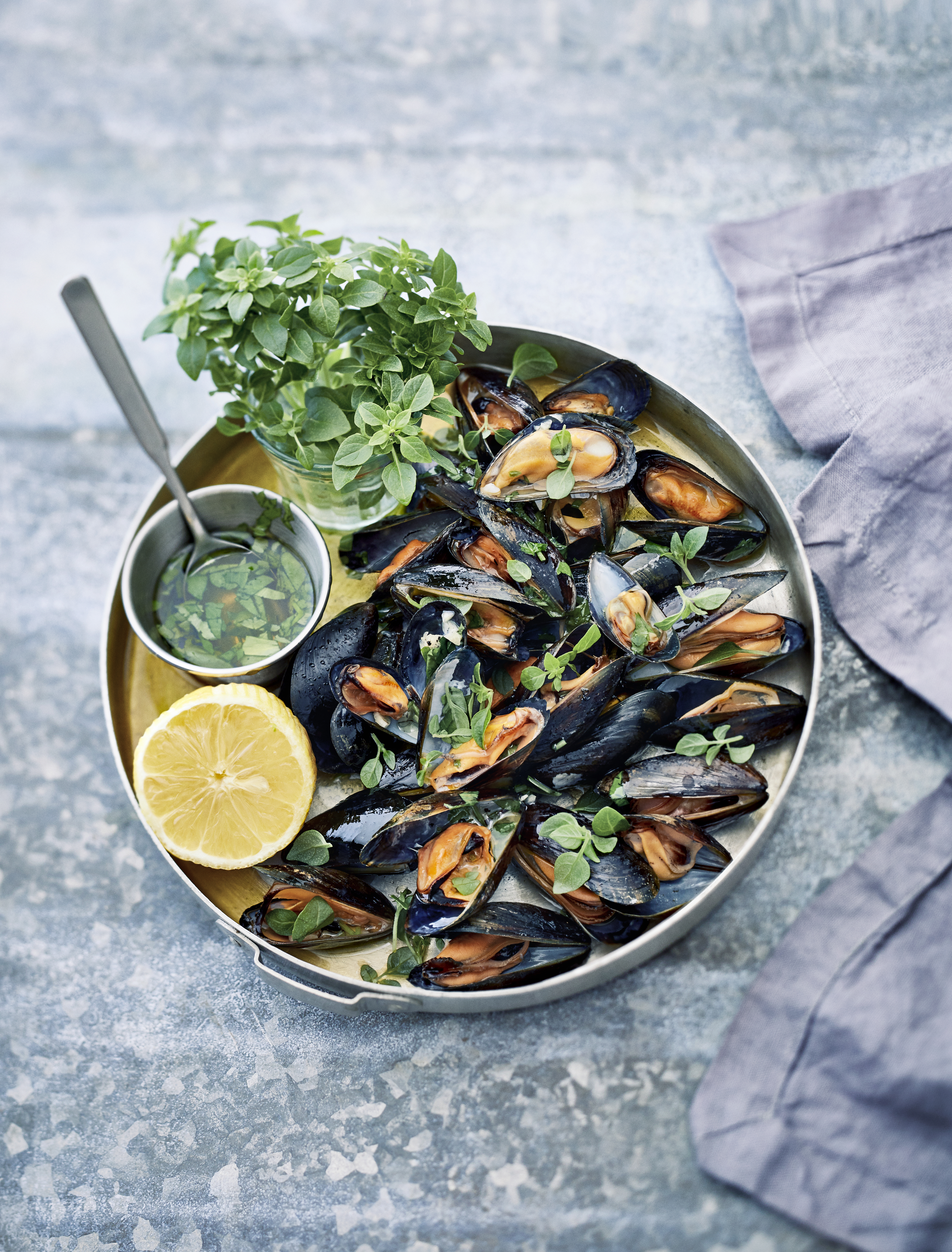 Sinisimpukat valmistuu näppärästi myös grillissä. Chili, ruohosipuli ja persilja viimeistelevät kokonaisuuden.