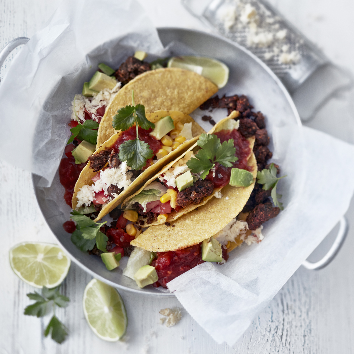 Kokoa tacot ja viimeistele raastetulla cheddarjuustolla.