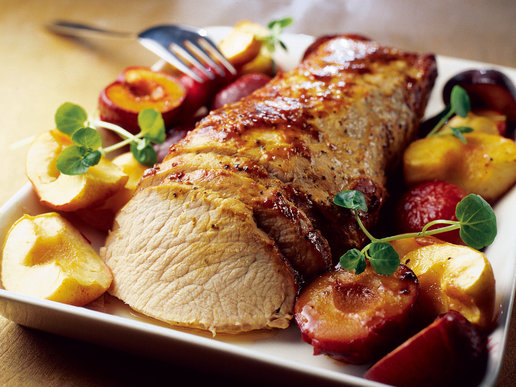 Sekoita mausteseos sokerista, sinapista, soija- ja chilikastikkeesta, suolasta sekä pippurista. Hiero seos fileen pintaan ja paista uunissa 175 asteessa noin 50 minuuttia.Pese ja halkaise omenat ja luumut. Poista siemenet ja kivet. Nosta hedelmät fileen molemmille puolille uuniin paistamisen puolivälissä. Tarjoile filee hedelmien, juuressoseen ja kastikkeen kanssa.»Juures-perunasose»Kastike uunissa paistetulle lihalle0905