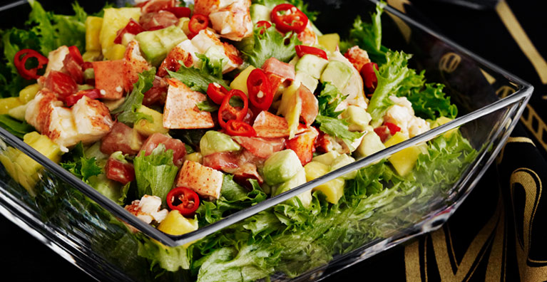 Aseta lautaselle rapeaa salaattia. Laita päälle avokado-mangosalaattia ja ylimmäksi hummeria. Pirskottele salaatinkastiketta annoksen päälle. Koristele chilillä. Tarjoile tuoreen leivän kanssa