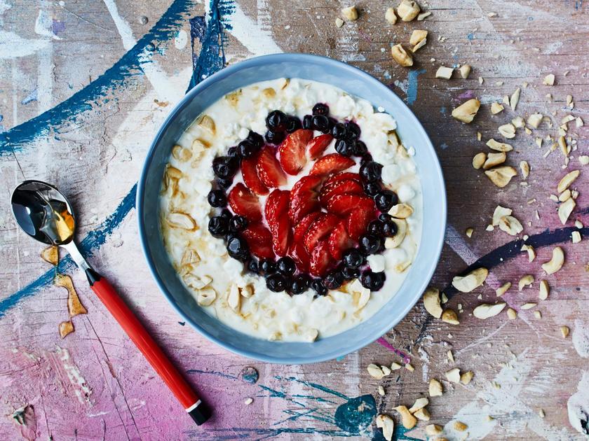 Hunajalla maustettu maitorahka-raejuustoseos ja marjat kasataan kulhoon trendikkään smoothie bowlin tyyliin. Tämä värikäs herkkukulho toimii aamu-, ilta- ja välipalana.