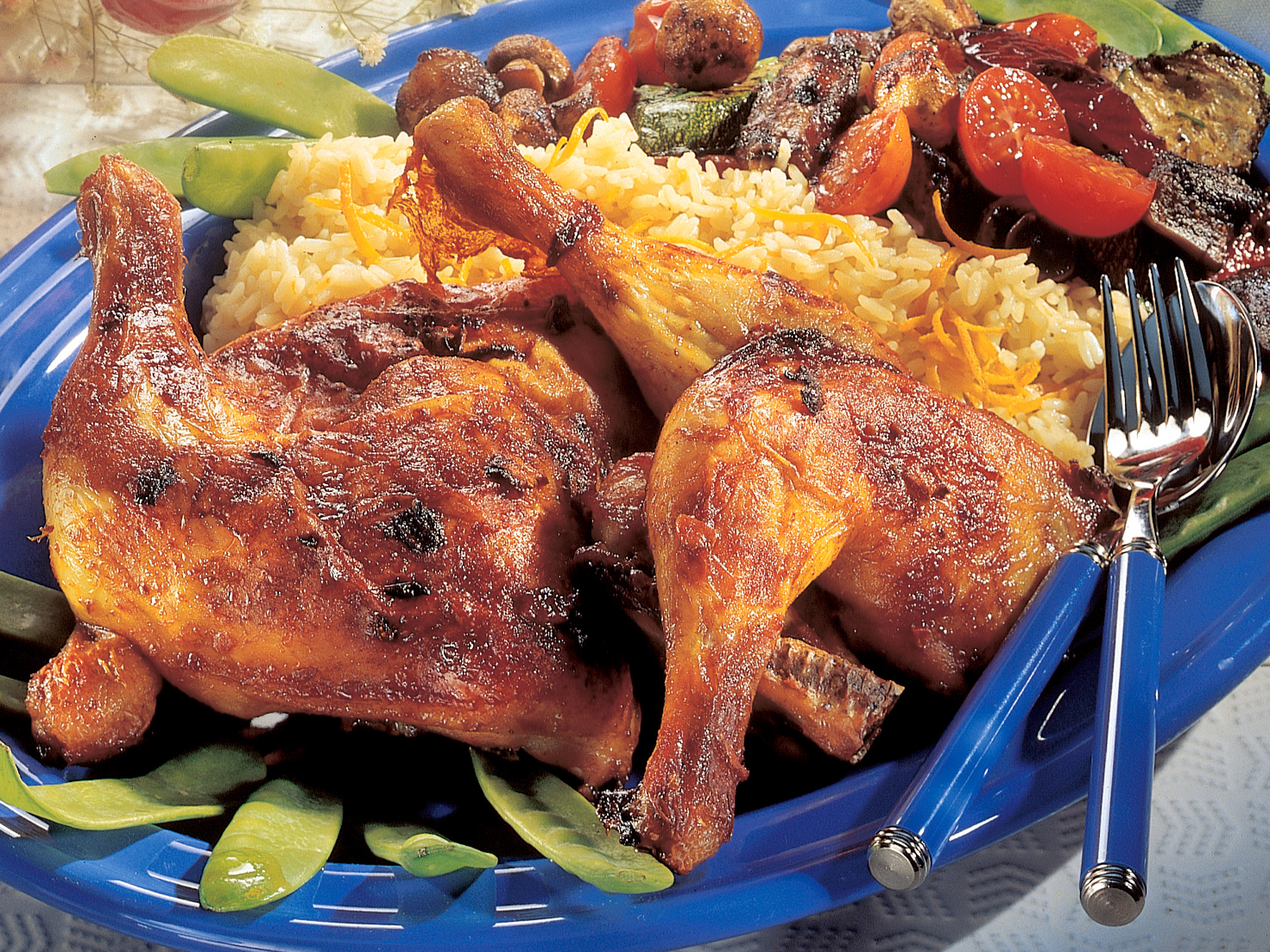 Sekoita marinadi. Voitele sillä broilerinkoivet ja laita peitetyssä kulhossa jääkaappiin. Anna maustua seuraavaan päivään. Kypsennä liha uunivuoassa 200 asteessa noin 30 minuuttia tai grillaa miedolla jälkilämmöllä noin 30-40 minuuttia. Broilerin koivet ovat kypsiä, kun luu käännettäessä irtoaa lihasta.Tarjoa lisänä öljyssä miedosti paistettuja, paloiteltuja herkkusieniä, kesäkurpitsaa tai kesäkurpitsan kukkia, munakoisoa, paprikaa, tomaattia ja banaania.