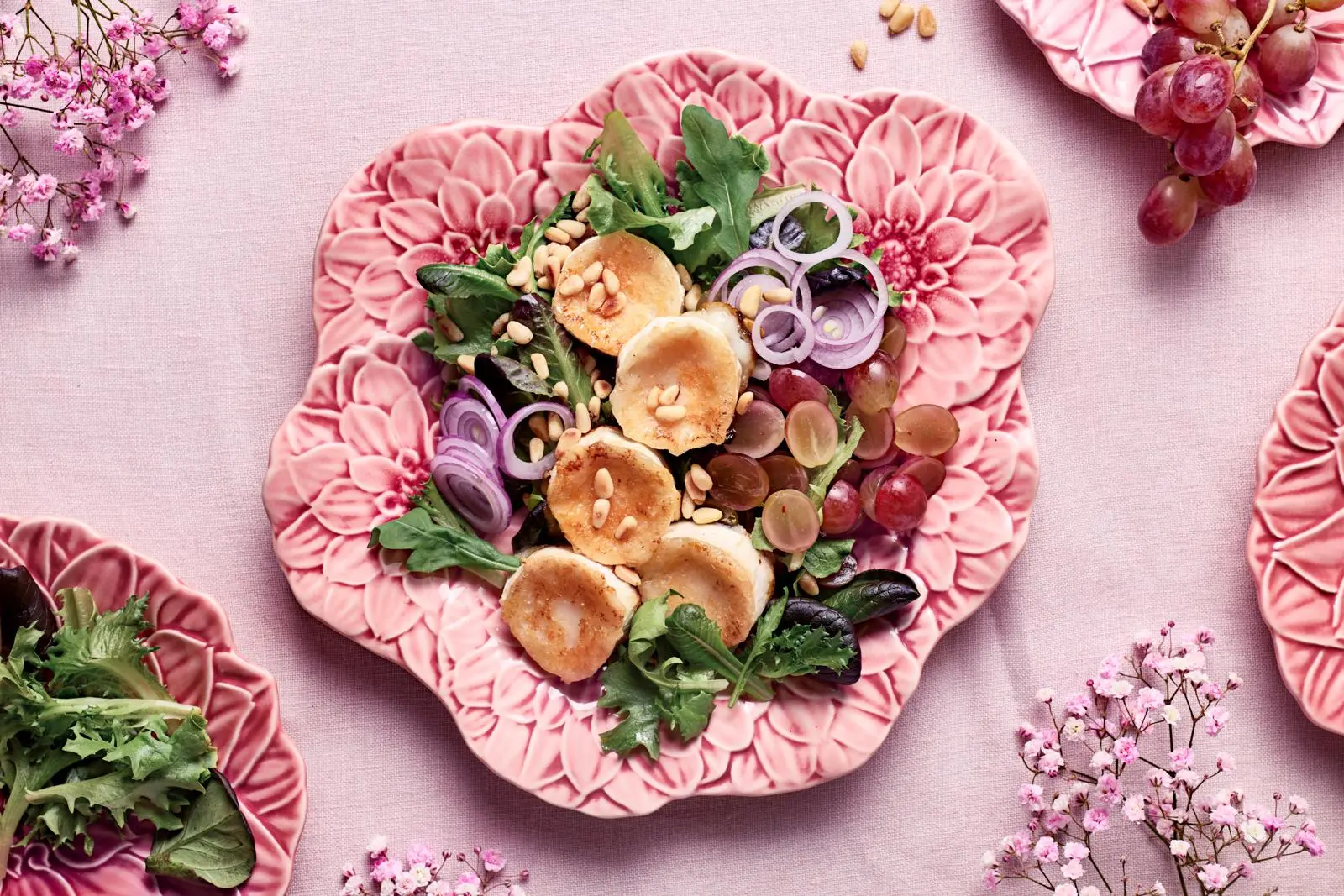 Vuohenjuustosalaatti hurmaa juhlapöydässä. Rapeat pinjansiemenet, sitruunainen vinegretti ja pehmeä vuohenjuusto täydentävät toisiaan ihanasti.