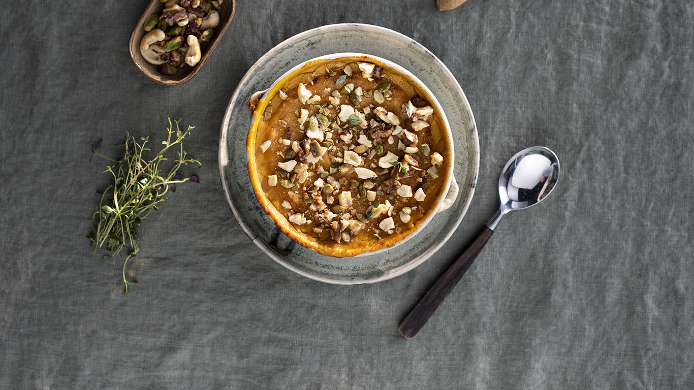 Valuta kurpitsat ja soseuta kaurajuoman, kaura fraichen ja oliiviöljyn kanssa. Lisää inkivääritahna ja jauhot. Mausta siirapilla ja suolalla.