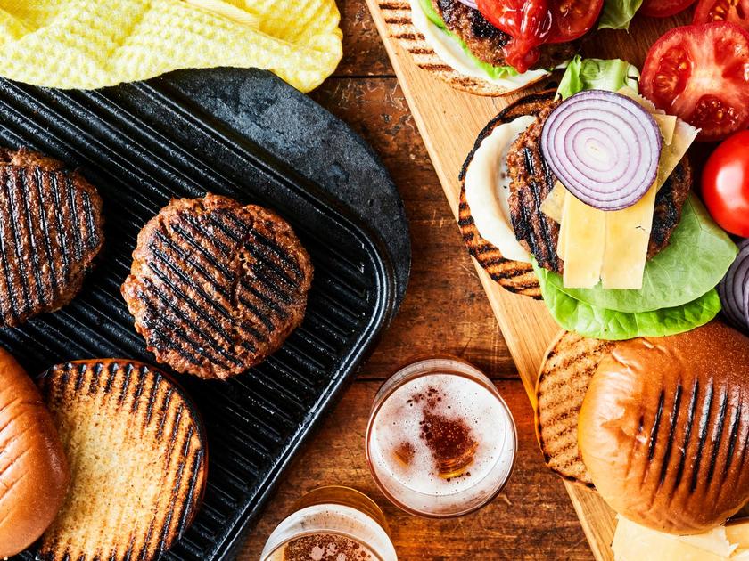 Mehevien jauhelihapihvien salaisuus on IPA-olut, jota käytetään korppujauhojen turvottamiseen. Olutpihvit sopivat täydellisesti hampparin väliin!