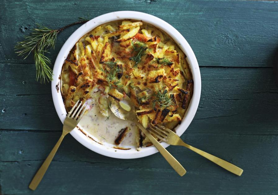 Kuori ja suikaloi perunat. Kuori ja hienonna sipuli. Paista sipuleita pannulla kunnes ne pehmenevät. Lisää perunasuikaleet ja paista keskilämmöllä käännellen noin 5 minuuttia. Lisää kerma ja valuta pannulle anjovisliemi. Jatka paistamista kunnes perunat ovat napakan pehmeitä, noin 15 minuuttia. Mausta perunat pippurilla. Kaada puolet perunaseoksesta laakeaan uunivuokaan. Aseta päälle anjovisfileet ja kylmäsavulohiviipaleet. Lisää loppu perunaseos. Ripottele päälle korppujauhot. Paista 250-asteisessa uunissa 5–10 minuuttia. Koristele hienonnetulla tillillä.