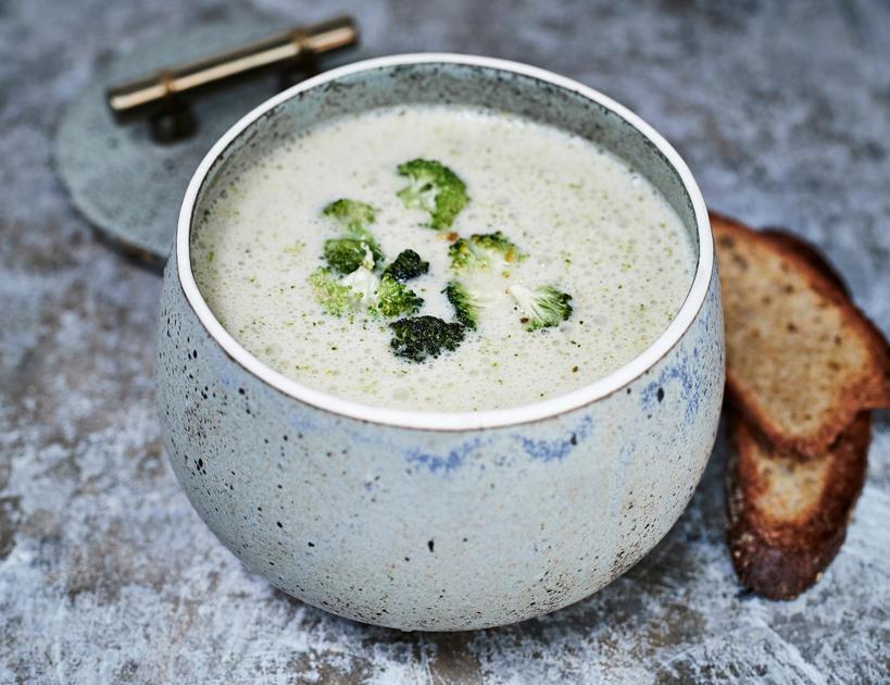 Soseuta keitto sauvasekoittimella. Annostele lautasille ja viimeistele paistetuilla parsakaalinupuilla.
