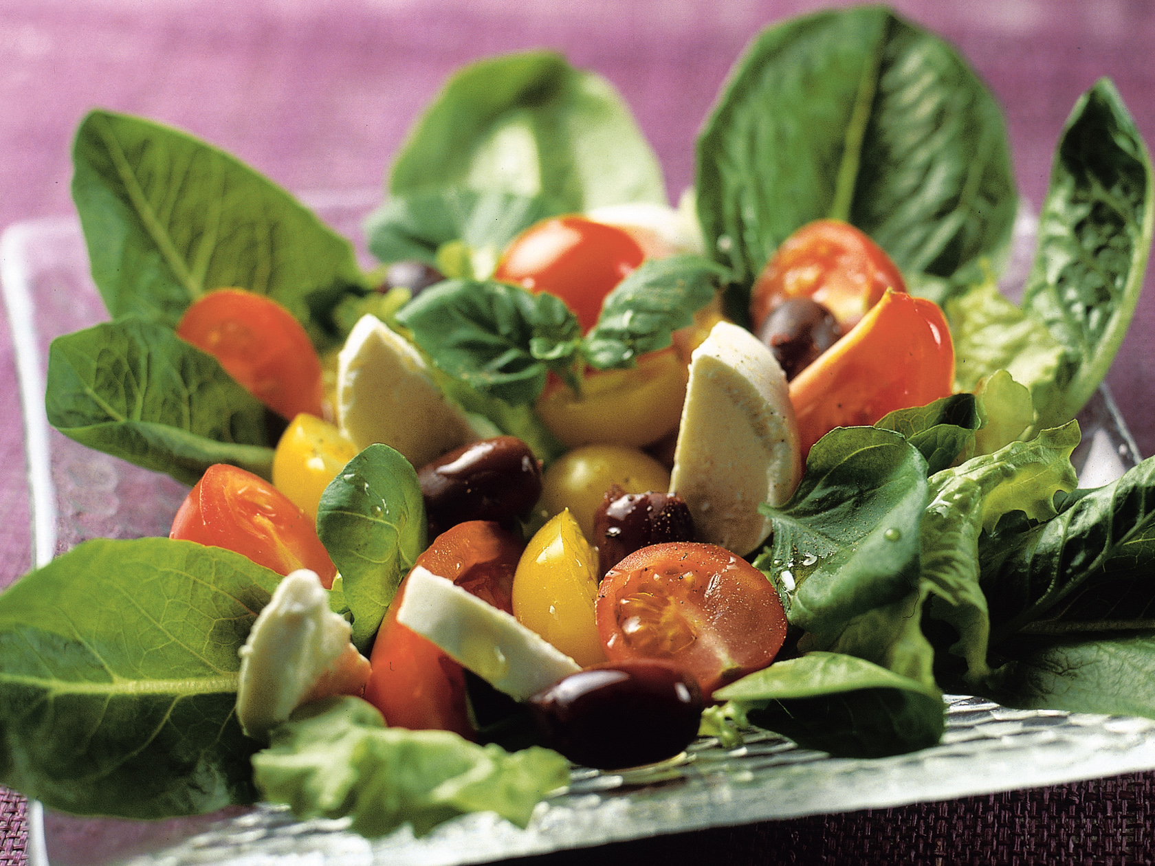 Huuhtele salaatti ja kuivata keittiöpyyhkeen sisällä. Paloittele juusto. Huuhtele tomaatit ja leikkaa punaiset tomaatit lohkoiksi. Revi salaatti tarjoiluastiaan, nosta sekaan juustopalat, tomaatit ja oliivit. Pudota sekaan basilikanlehtiä ja mustapippuriruohetta. Valuta salaatin päälle hieman öljyä ja tarjoile.