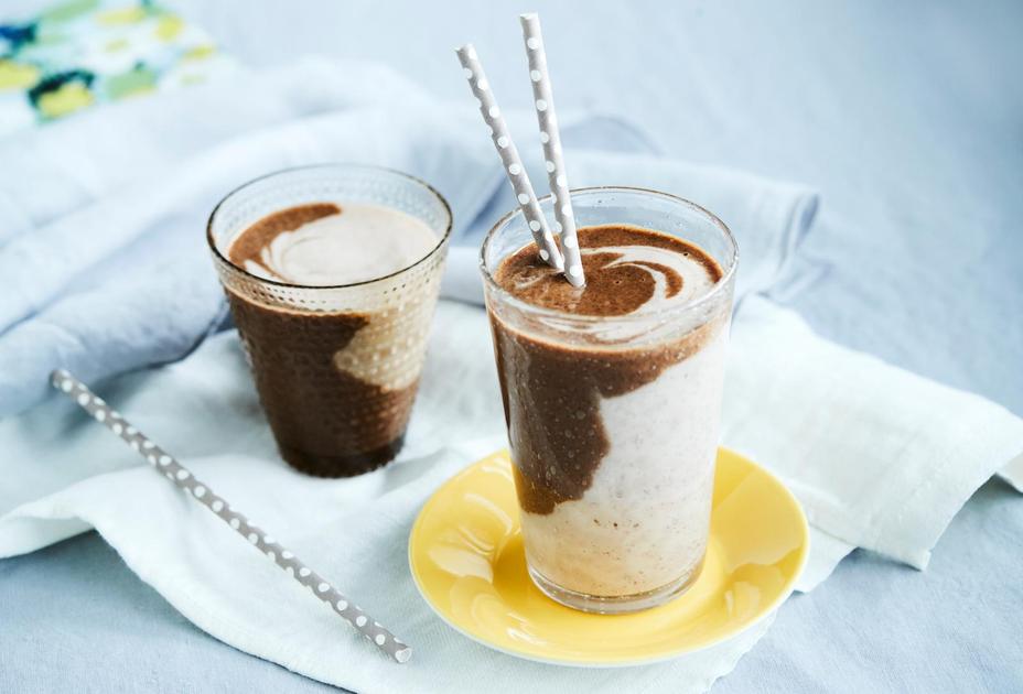 Kokoa smoothie lasiin siten, että valutat lasin eri reunoilta yhtä aikaa tummaa ja vaaleaa smoothieta.