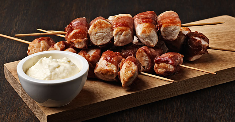 Pyöräytä jokaisen vartaan ympäri tiukasti ilmakuivattua kinkkua.