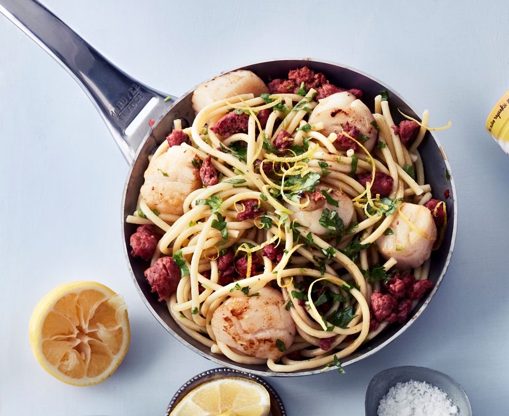 Lisää ne pastan sekaan. (Jos pasta tuntuu kuivalta voit lisätä sekaan hieman keitinvettä). Tarjoile sitruunalohkojen kanssa.