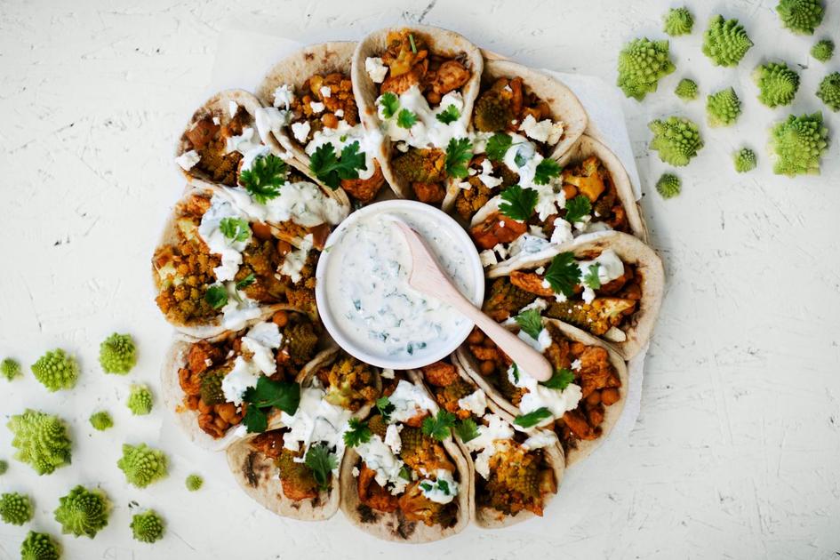 Nämä tacomaustetut kanarieskat täytetään hauskannäköisellä romanescolla ja lisäksi mukana on kikherneitä, fetajuustoa ja pirteää korianterikastiketta.