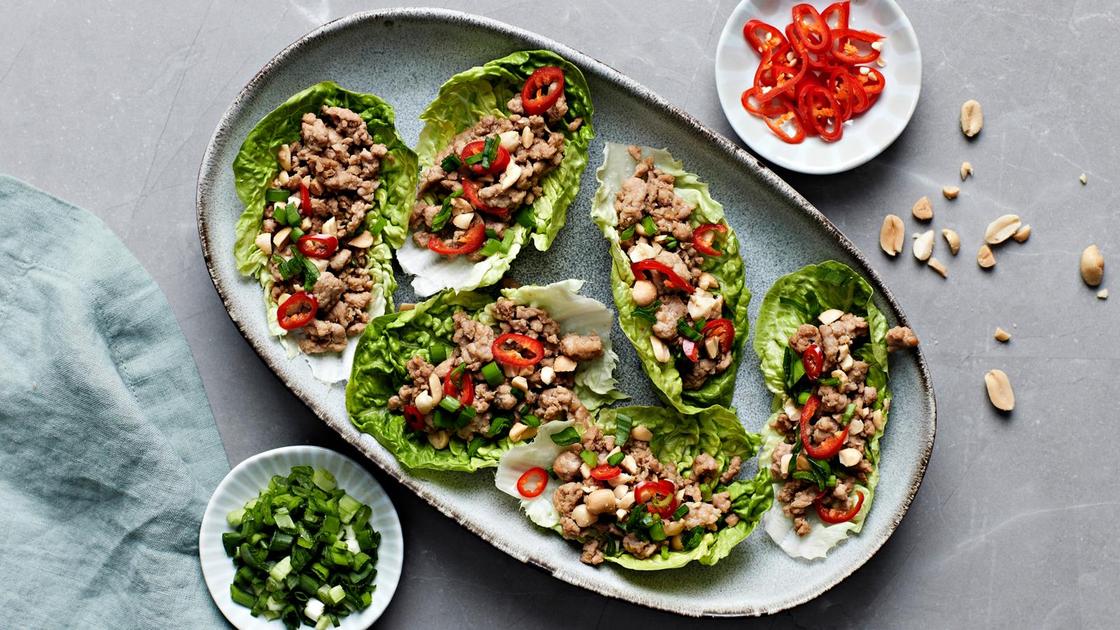 Huuhtele salaatinlehdet ja aseta ne tarjoiluastiaan. Rouhi pähkinät, viipaloi kevätsipulit ja chili. Lusikoi jauhelihaseos salaatinlehdille. Lisää pähkinät, kevätsipulit ja chili annoksiin.