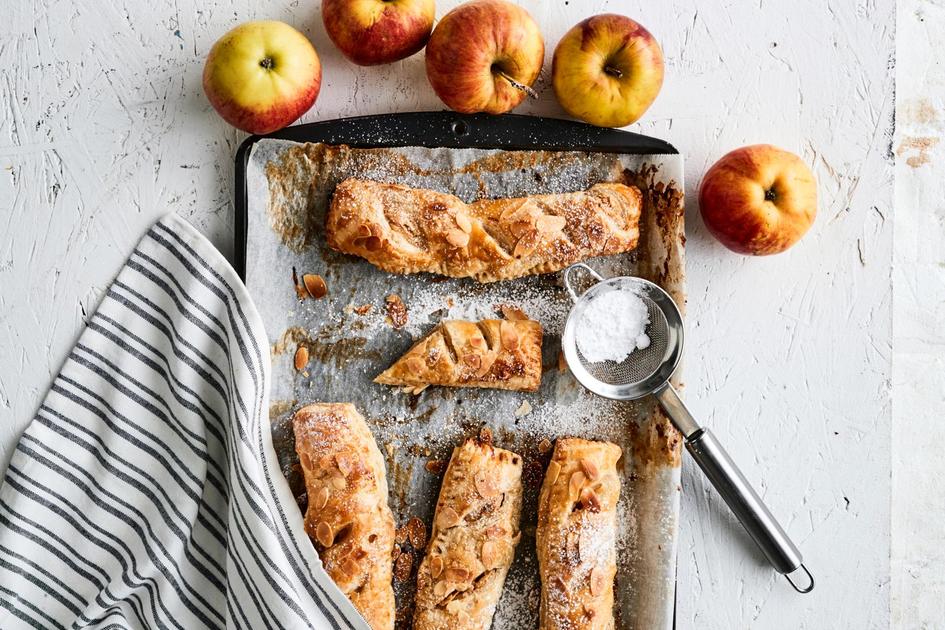 Voitele 1 cm reunoista kananmunalla. Levitä taikinan toiselle puolelle pitkittäin noin 1 ½ rkl tuorejuustoseosta ja ohut kerros omenaviipaleita. Taita taikina täytteen päälle ja paina reunat kiinni niin, että saat pitkiä pasteijoita. Voitele kananmunalla ja ripota mantelilastuja päälle. Paista uunissa 15–18 minuuttia.