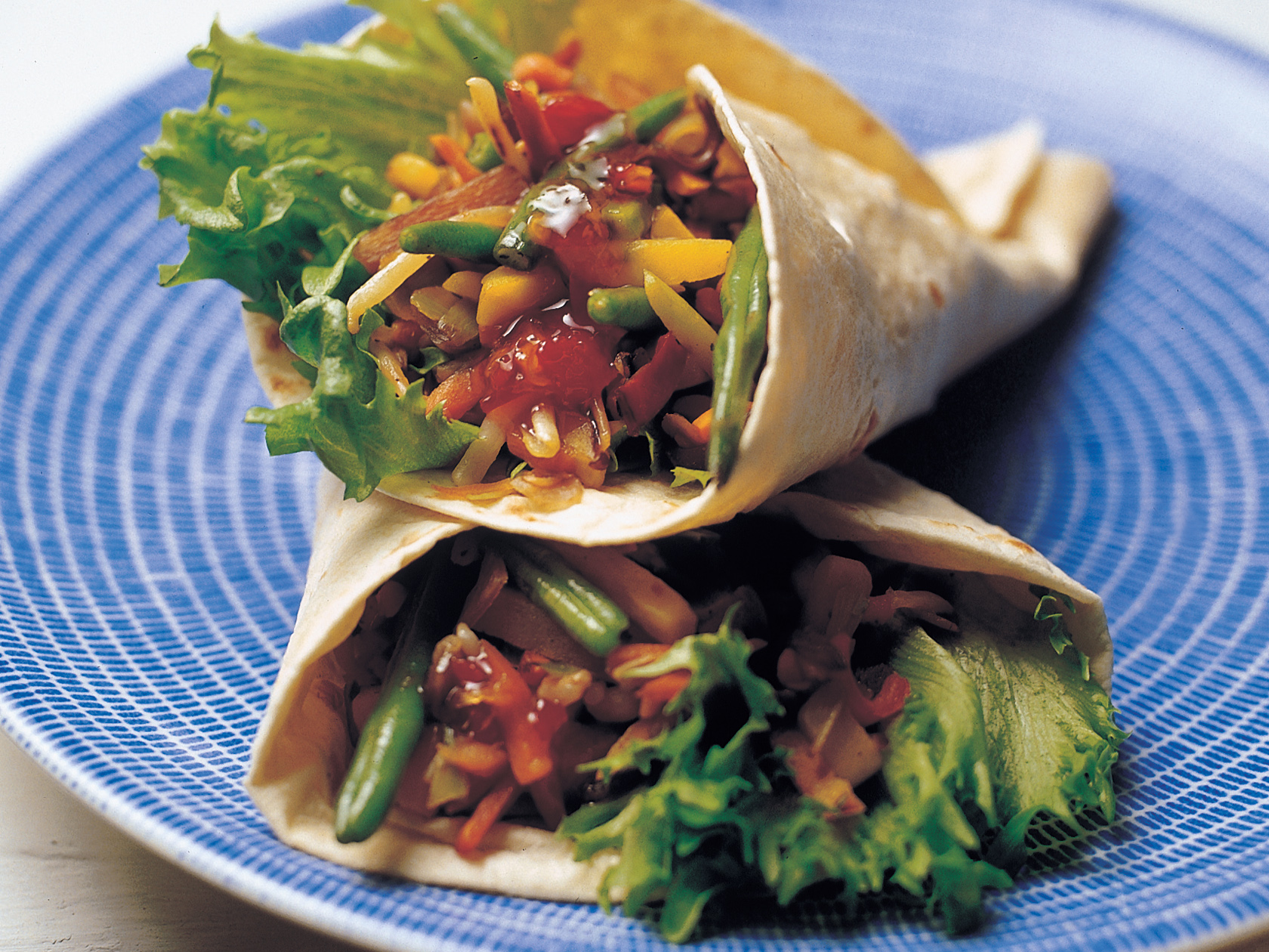 Pese tomaatit ja kuutioi ne. Valuta maissit, oliivit ja kikherneet. Revi salaatti. Sekoita kastike kermaviilistä, murennetusta sinihomejuustosta ja sitruunanmehusta. Sekoita täyte tomaattikuutioista, maissista, oliiveista ja kikherneistä. Lisää joukkoon kastike. Annostele täyte kuudelle tortillaletulle ja ripottele jokaiselle salaattia. Sulje tortilla wrapiksi ja kiedo rullan ympärille leivin- tai voipaperi ja pakkaa evääksi.