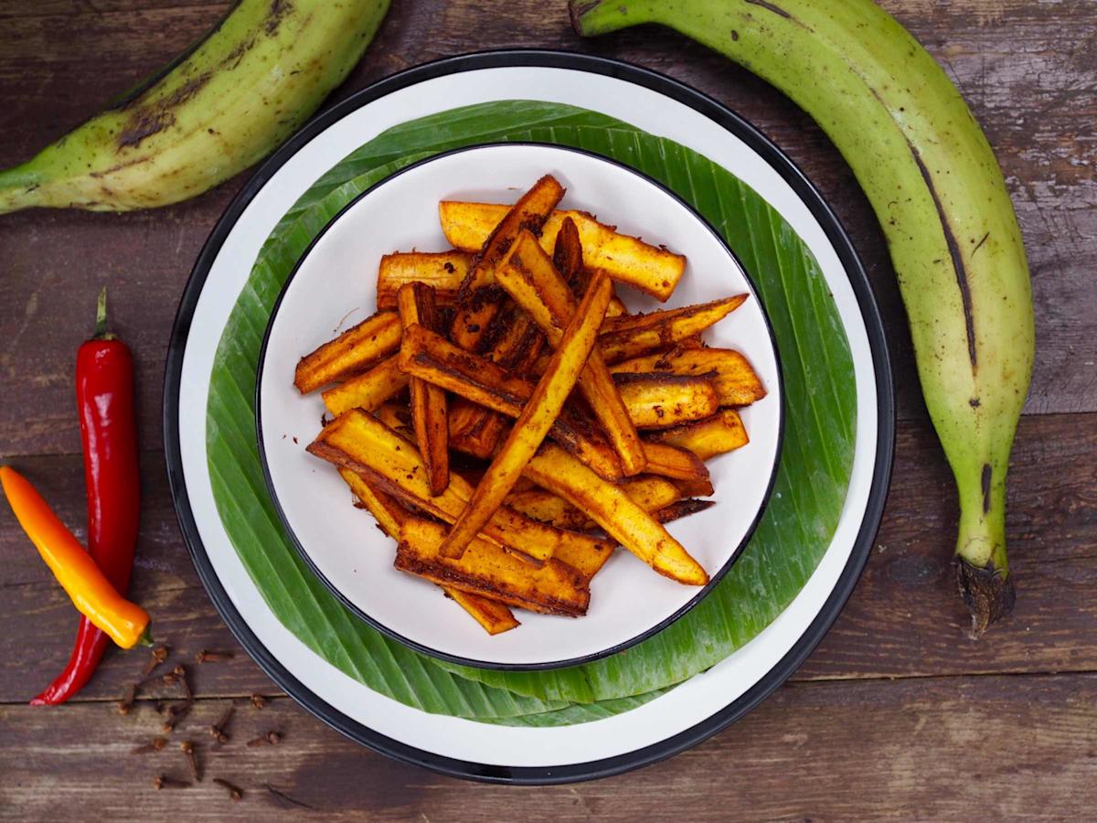 Ranskalaiset valmistetaan vihreistä keittobanaaneista, jotka ovat mainio perunankorvike. Rapeat keittobanaaniranskikset saavat pinnalle hauskan mausteseoksen.