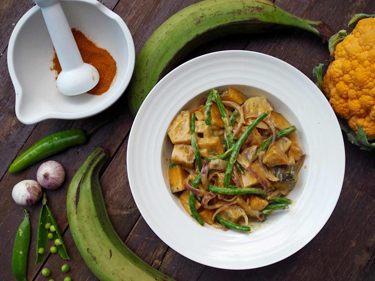 Keittobanaanicurry on herkullisen mausteinen kasviscurry, jonka maku pyöristetään kookoskermalla. Vihreä keittobanaani muistuttaa hieman perunaa ja sopii siksi curryyn loistavasti.