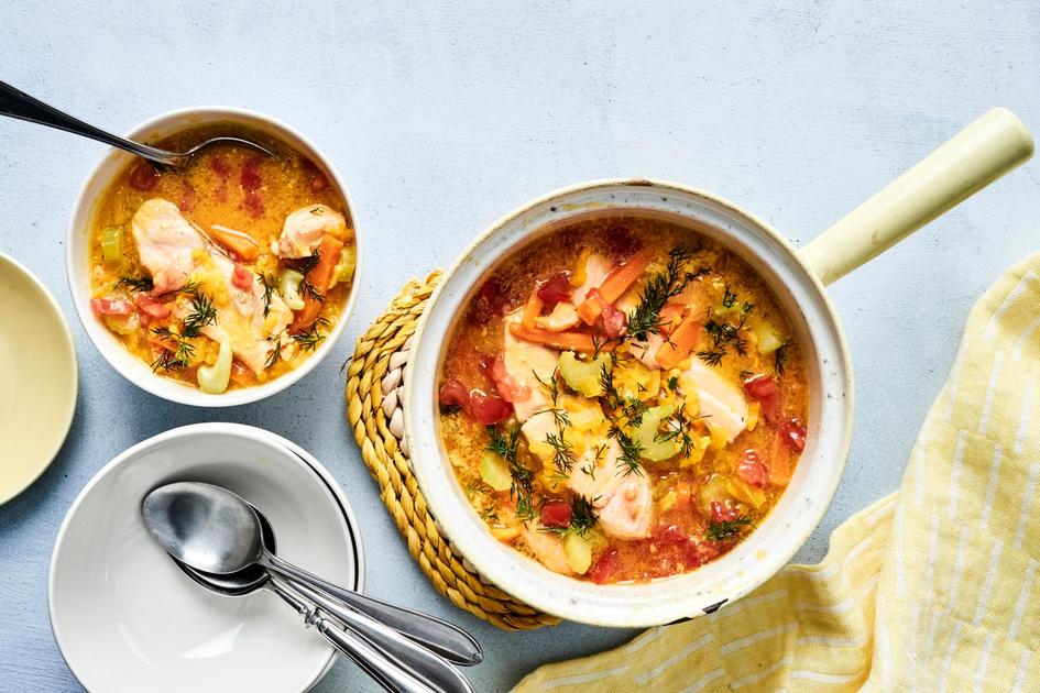Keltainen lohikeitolle saa kullankeltaisen värin ja juhlavan maun sahramista. Riisi lisää ruokaisuutta, appelsiinimehu ja tuoreet tomaatit viimeistelevät kokonaisuuden!