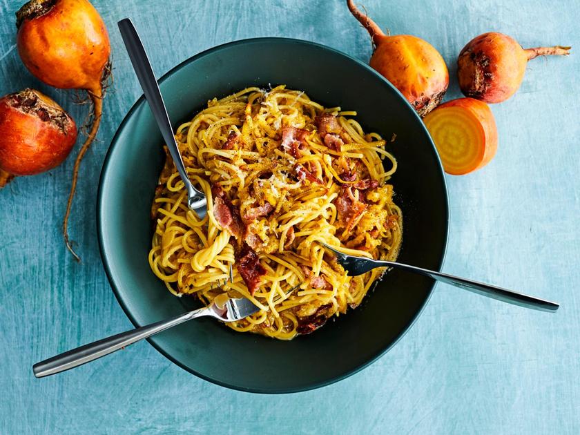 Pasta carbonaran sesonkijuuresversiossa loistaa keltajuuri. Paras kastike syntyy huoneenlämpöisistä kananmunista ja reilusta kourallisesta parmesaania.