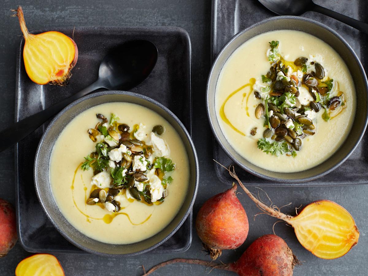 Surauta sosekeitto vaihteeksi makoisasta keltajuuresta. Pirteän keltainen keitto maustetaan fetalla ja viimeistellään rouskuvalla ripotteella.