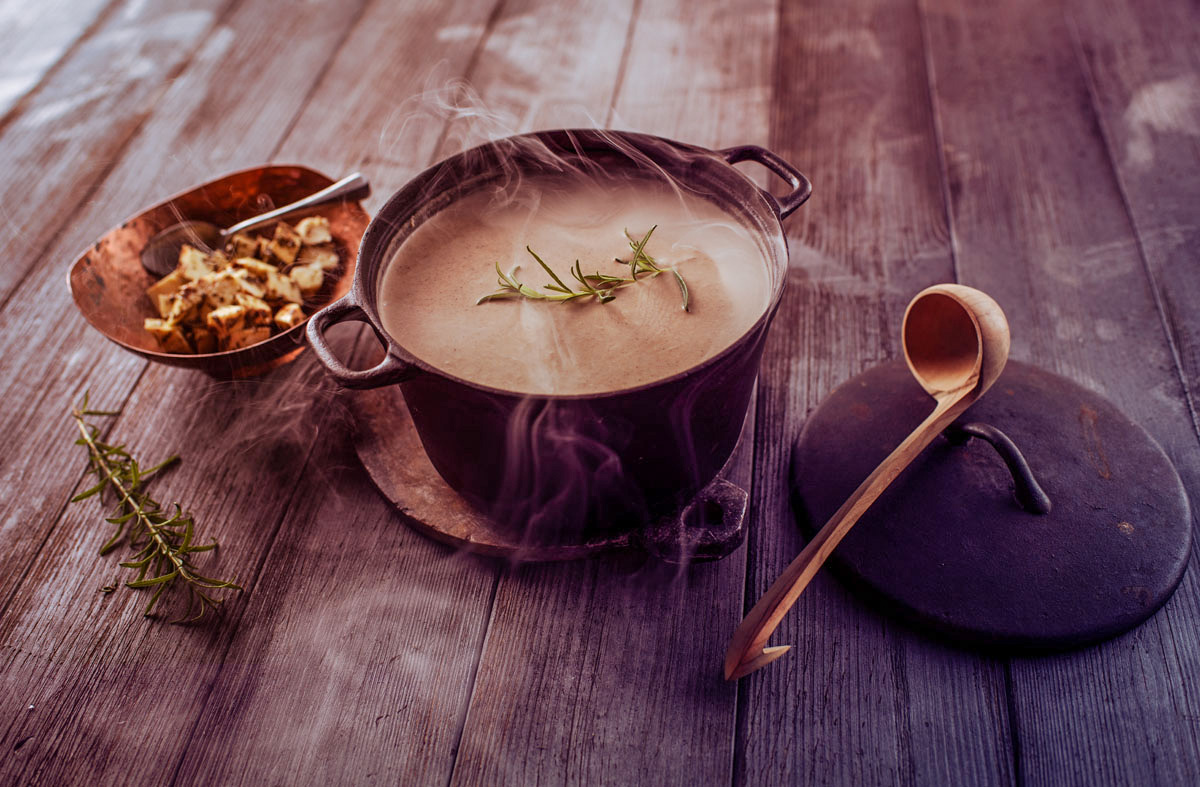 Kuumenna voi kattilassa. Kuullota sipuleita ja porokuutioita voissa noin 5 minuuttia. Älä anna voin ja sipulin ruskistua. Lisää valmis kanaliemi ja kuoritut kuutioidut perunat ja keitä, kunnes perunat ovat kypsiä. Lisää kerma, sienet ja mausteet ja anna kiehua vielä muutama minuutti. Soseuta keitto sileäksi tehosekoittimella tai sauvasekoittimella. Tarkista maku.