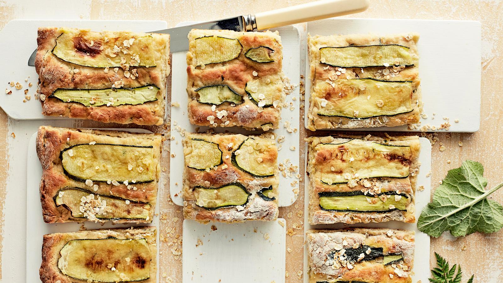 Huuhtele pinnalle tuleva kesäkurpitsa ja vuole siitä esimerkiksi juustohöylällä pitkiä ohuita viipaleita. Asettele viipaleet leivän pinnalle. Ripottele hiutaleet leivälle. Leikkaa leipä halutessasi veitsellä ruudukoksi. Paina veitsi pohjaan saakka, jotta ruudukko säilyy paistamisen aikana.