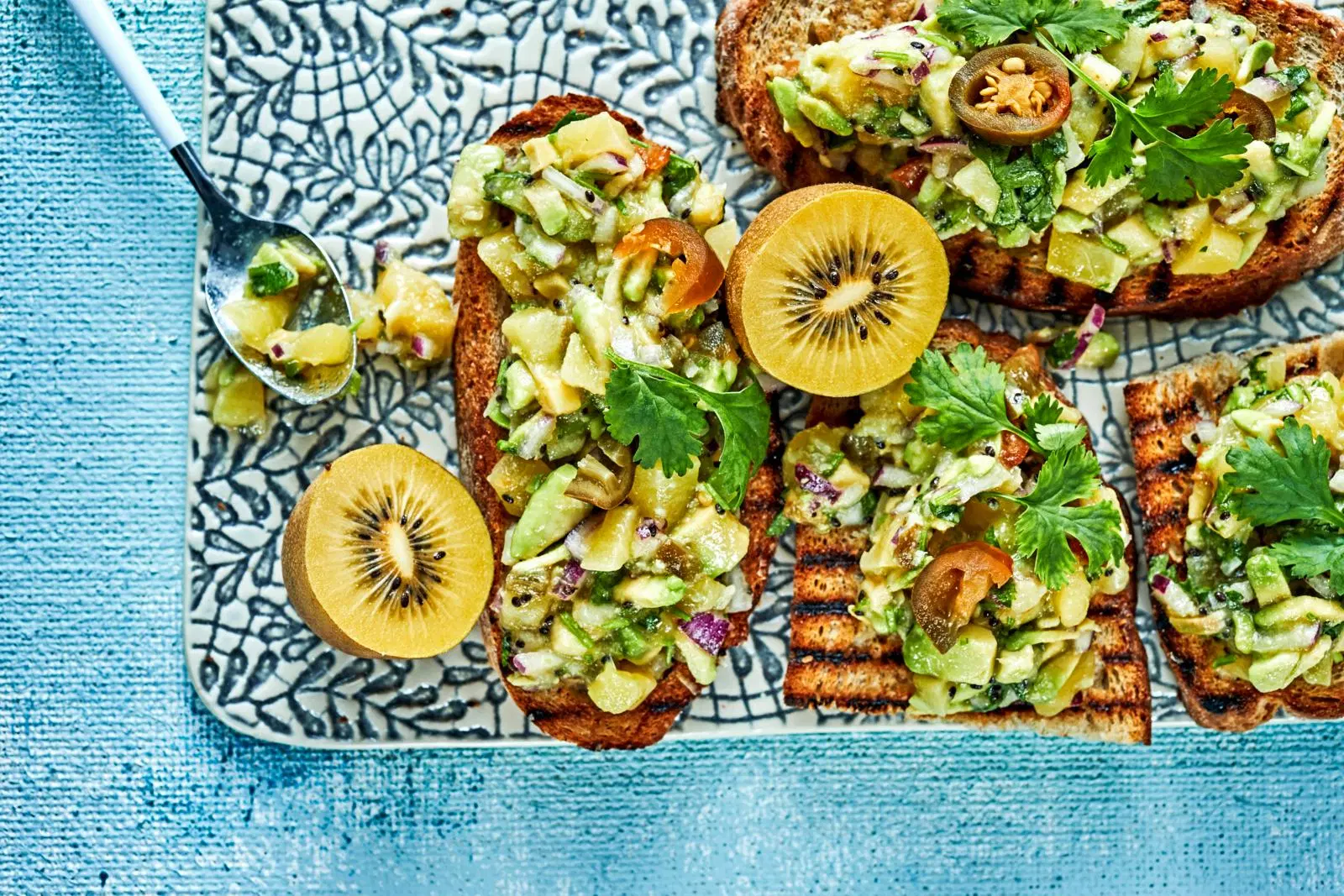 Lusikoi kiiviguacamolea leiville ja tarjoa heti.