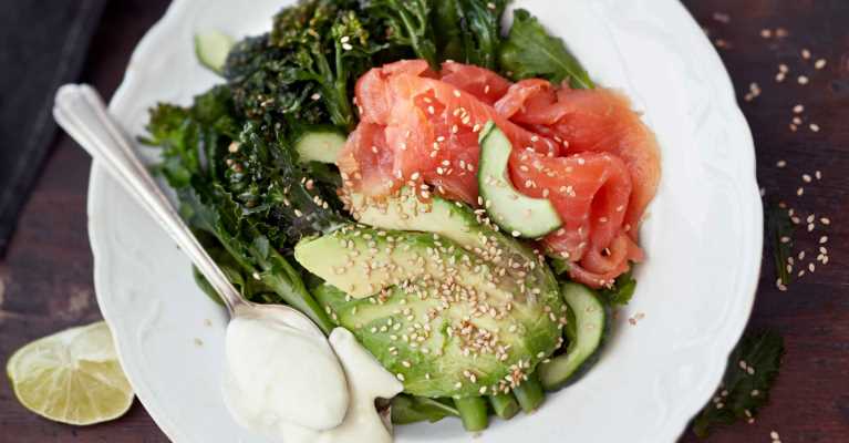 Jaa salaatti neljälle lautaselle. Viimeistele kylmäsavukirjolohella ja paahdetuilla seesaminsiemenillä. Tarjoile wasabijogurtin kanssa.
