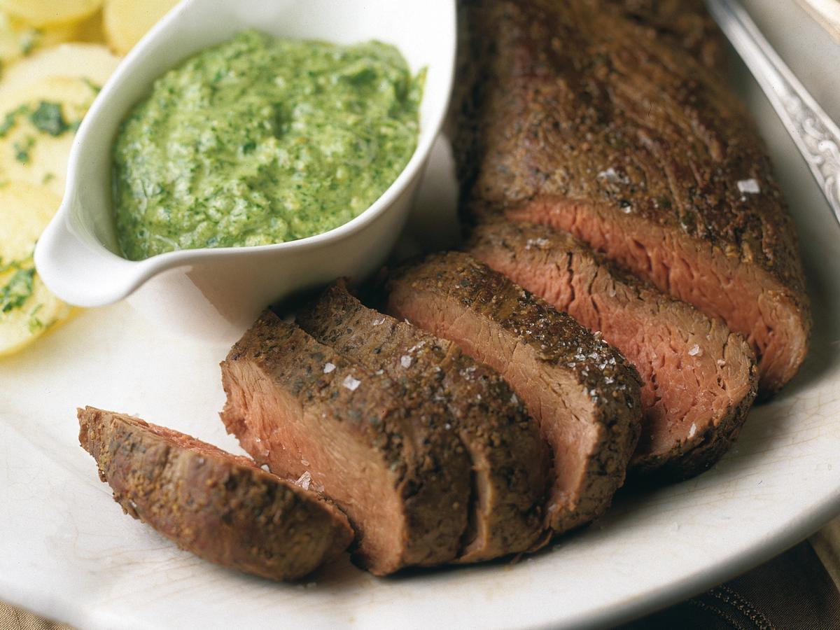Kuumenna uuni 175 asteeseen. Leikkaa lihasta käyttöön vain sen tasakokoinen keskiosa. Hyödynnä yli jäävät palat esimerkiksi paistamalla niistä pihvejä. Poista lihasta kalvot terävällä veitsellä.Hiero pippurit fileen pintaan. Kuumenna pannu kuumaksi, lisää rasva ja ruskista liha siinä kauttaaltaan.Paina lihalämpömittari lihanpaksuimpaan kohtaan. Siirrä liha uunivuokaan ja kypsennä, kunnes sen sisälämpö osoittaa 57-astetta. Ripottele pinnalle suolaa.Ota liha uunista ja kääri folioon vetäytymään 30 minuutiksi. Muista, että lihan sisälämpö nousee vielä hieman tässä vaiheessa. Leikkaa liha viipaleiksi uunissa kuumennetulle tarjoiluvadille juuri ennen tarjoilua. Tarjoa homejuustokastikkeen ja valkosipuliperunoiden kanssa.
