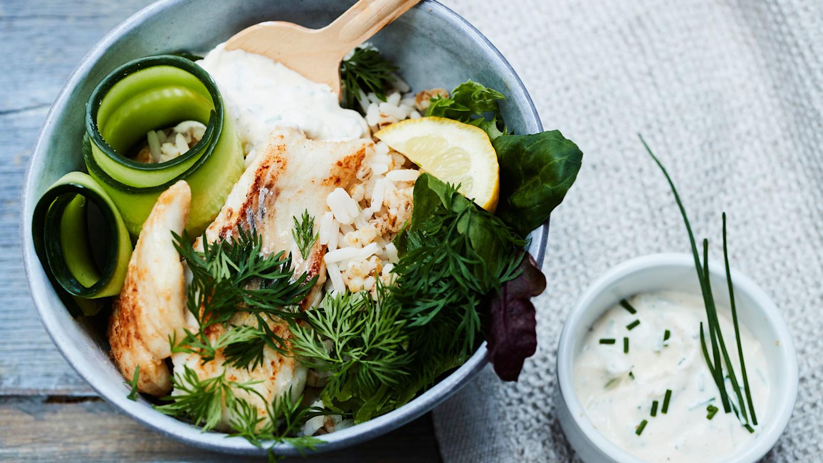 Tee trendikäs kulhoruoka suomalaiseen tyyliin kuhasta ja riisi-ohraseoksesta. Kevennä kalakulho salaatilla ja piristä piparjuuri-ruohosipulikastikkeella.