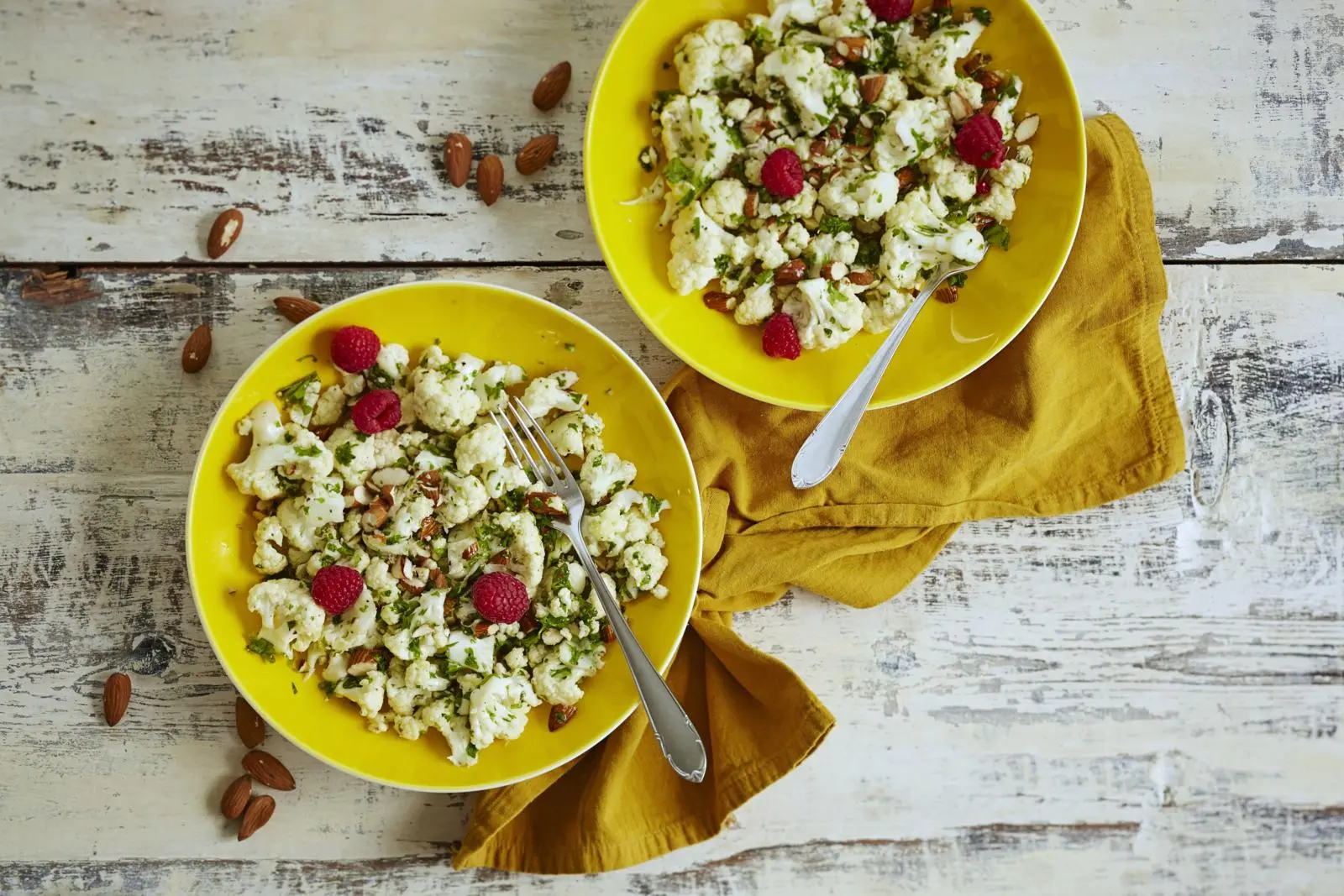 Rapsakasta kukkakaalista ja makeasta vadelmasta valmistuu kesän yllättäjä: kevyt ja ihana lisukesalaatti. Nauti sellaisenaan tai grilliruoan kanssa.