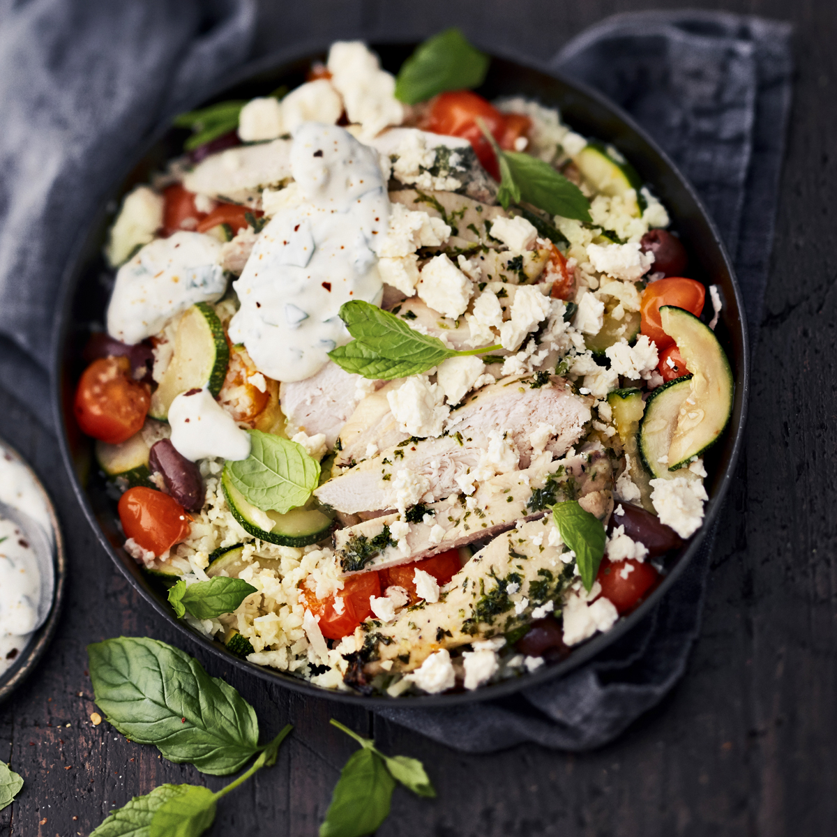 Lämmitä ljyä pannussa ja lisää kesäkurpitsat, mausta suolalla ja pippurilla.Paista hetke ja lisää kukkakaali, tomaatit ja oliivit. Purista sitruunaa joukkoon ja murusta feta pintaan.