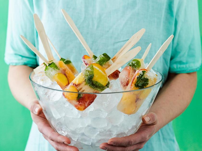 Kuohuviini-persikkamehujää virkistää helteellä ja toimii grilliaterian kevyen raikkaana jälkiruokana.